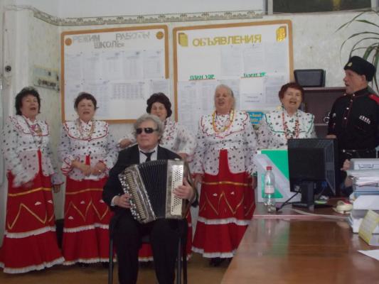 Ансамбль казачьей песни «Надежда» и Евгений Стуколов поздравили женщин- учителей с весенним праздником своими весёлыми песнями и напевами. Для учителей это стало искренним музыкальным подарком.