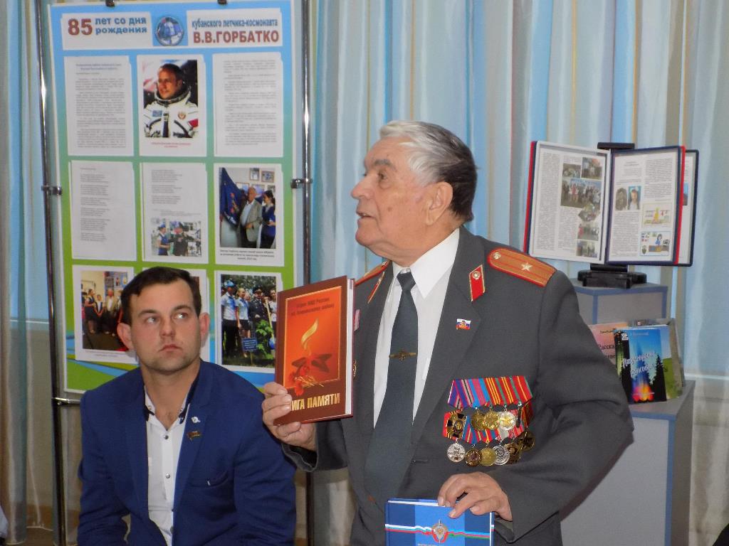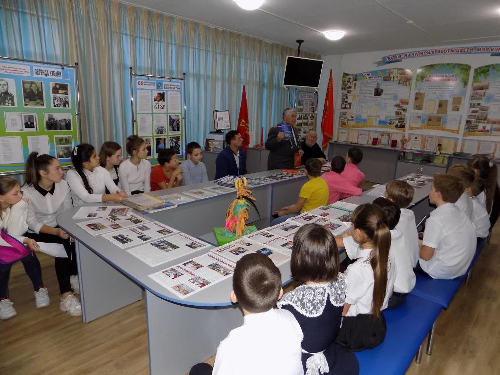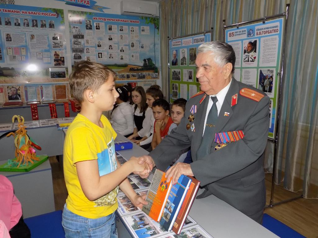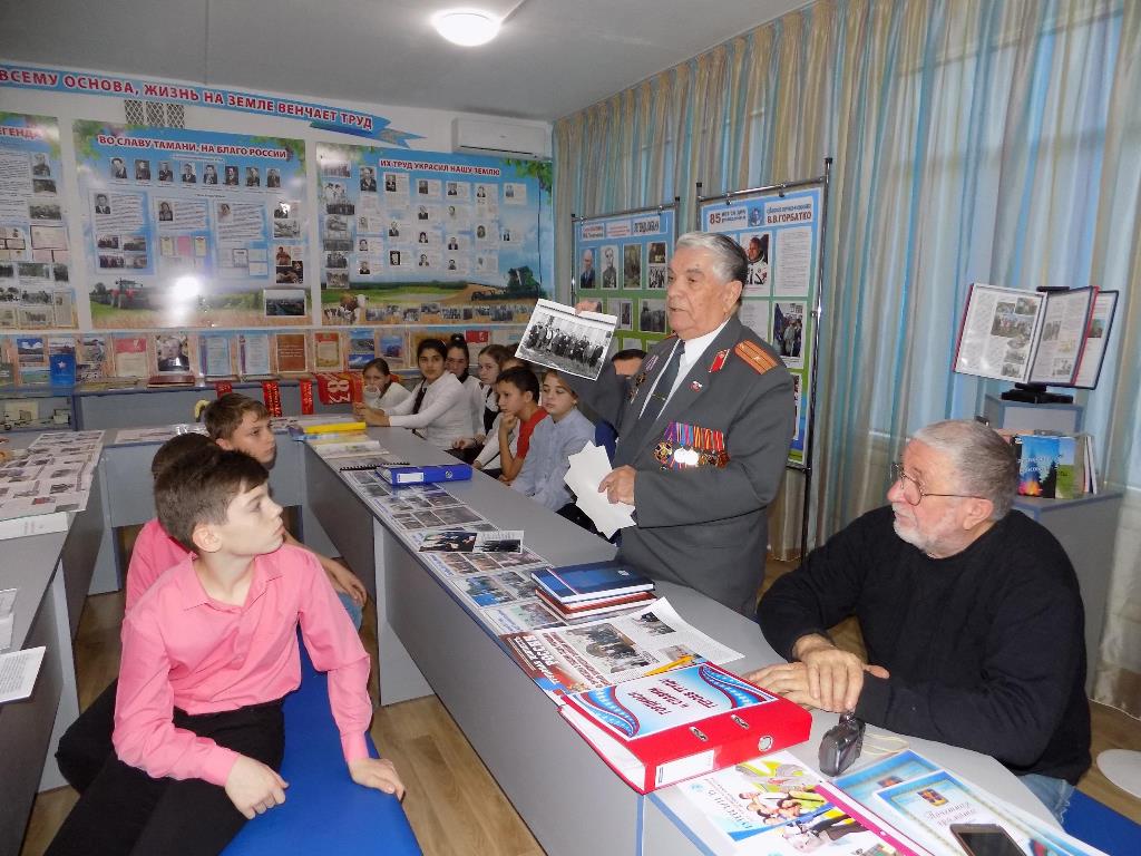 На встрече присутствовали активисты Темрюкского местного отделения ВОО «Трудовая доблесть России» - член Совета ветеранов Темрюкского района, председатель ветеранской организации ОВД Темрюкского района Н.Я Каунев и руководитель творческого союза «Троя» художник В.А.Гресс. Николай Яковлевич рассказал ребятам о подвигах сотрудников отдела МВД и передал в школьный музей книги «Место службы - Тамань», Книгу Памяти Отдела МВД России по Темрюкскому району, а также фотографии Героев Труда, о которых рассказали гостям в экскурсии юные музееведы школы.