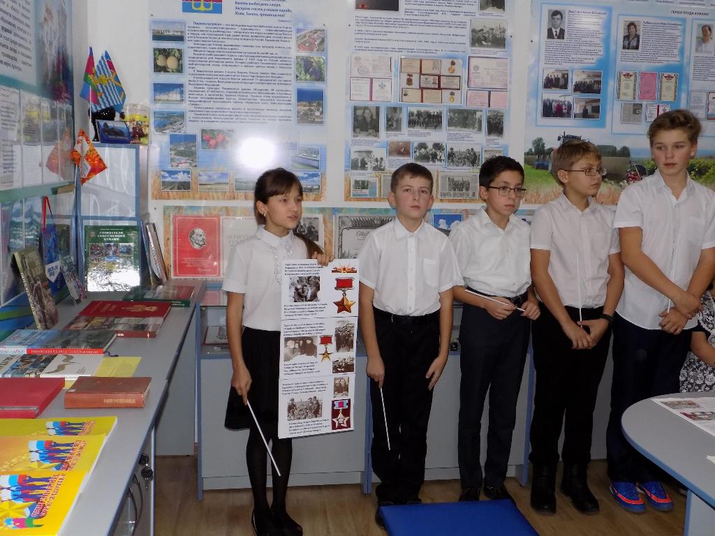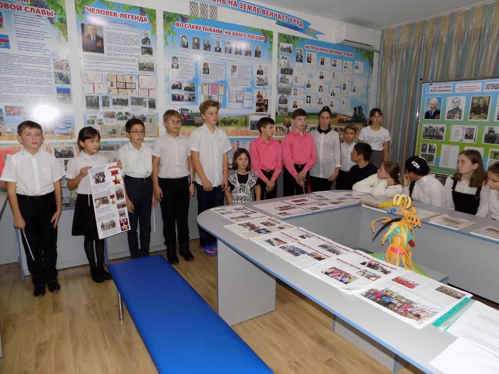 В экспозиции музея – портреты Героев Социалистического Труда и Героев Труда Кубани, биографии которых изучали юные музееведы в течение двух месяцев нынешнего учебного года. Ребята проводили экскурсии, готовили доклады, участвовали в викторине о великих тружениках-земляках. В истории Темрюкского района хранится память о десятерых Героях Социалистического Труда, из них шесть участников Великой Отечественной войны 1941-1945г.г.: В.И.Головченко, Б.А.Анашкин, Ф.Н. Батицкий, С.Н. Приболовец, И.И. Погиба, Г.И. Шахов. Имя П.Ф. Ломако - советского государственного деятеля, наркома и министра, руководителя цветной металлургии СССР, специалиста в области цветной металлургии занесено в Книгу рекордов Гиннеса. Во время Великой Отечественной войны Петр Ломако руководил эвакуацией предприятий за Урал, организацией производства, в послевоенные годы – восстановлением разрушенного хозяйства.