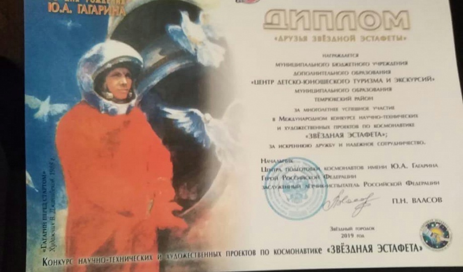 Обучающиеся МБУ ДО ЦДЮТиЭ Темрюкского района стали призерами XVII международного конкурса научно-технических и художественных проектов по космонавтике «Звёздная эстафета», который состоялся 29 ноября на базе Центра подготовки космонавтов имени Ю.А. Гагарина.